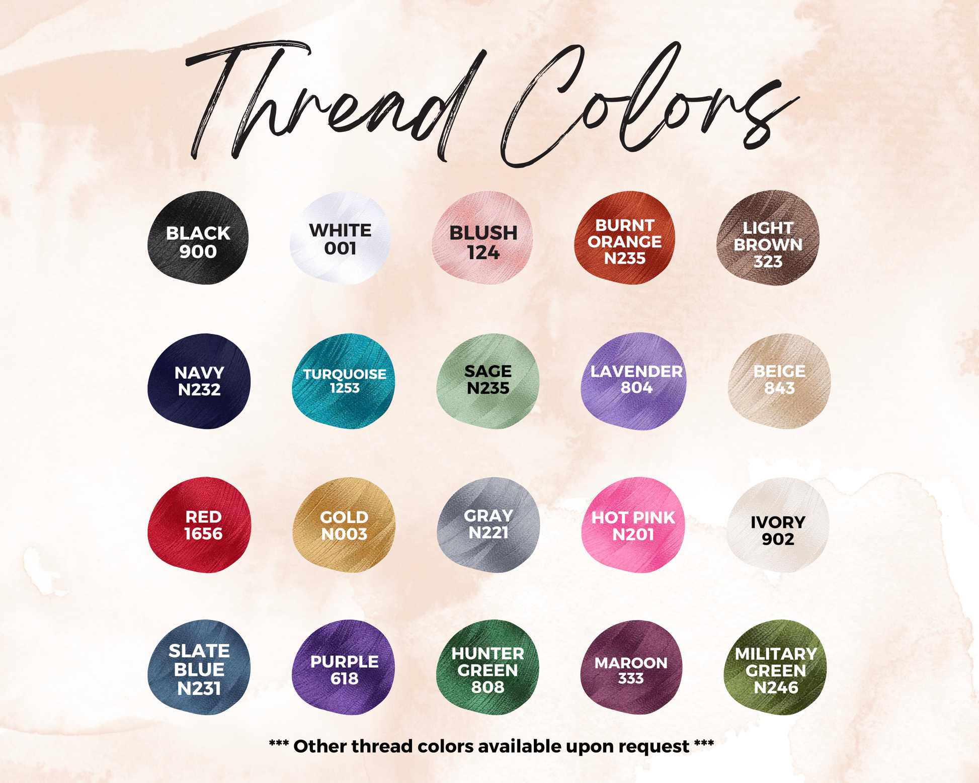 🎨 Thread Colors: Select from 18+ vibrant thread colors (blush, sage, hunter green, maroon, gold, lavender, etc.). Custom thread colors available upon request.