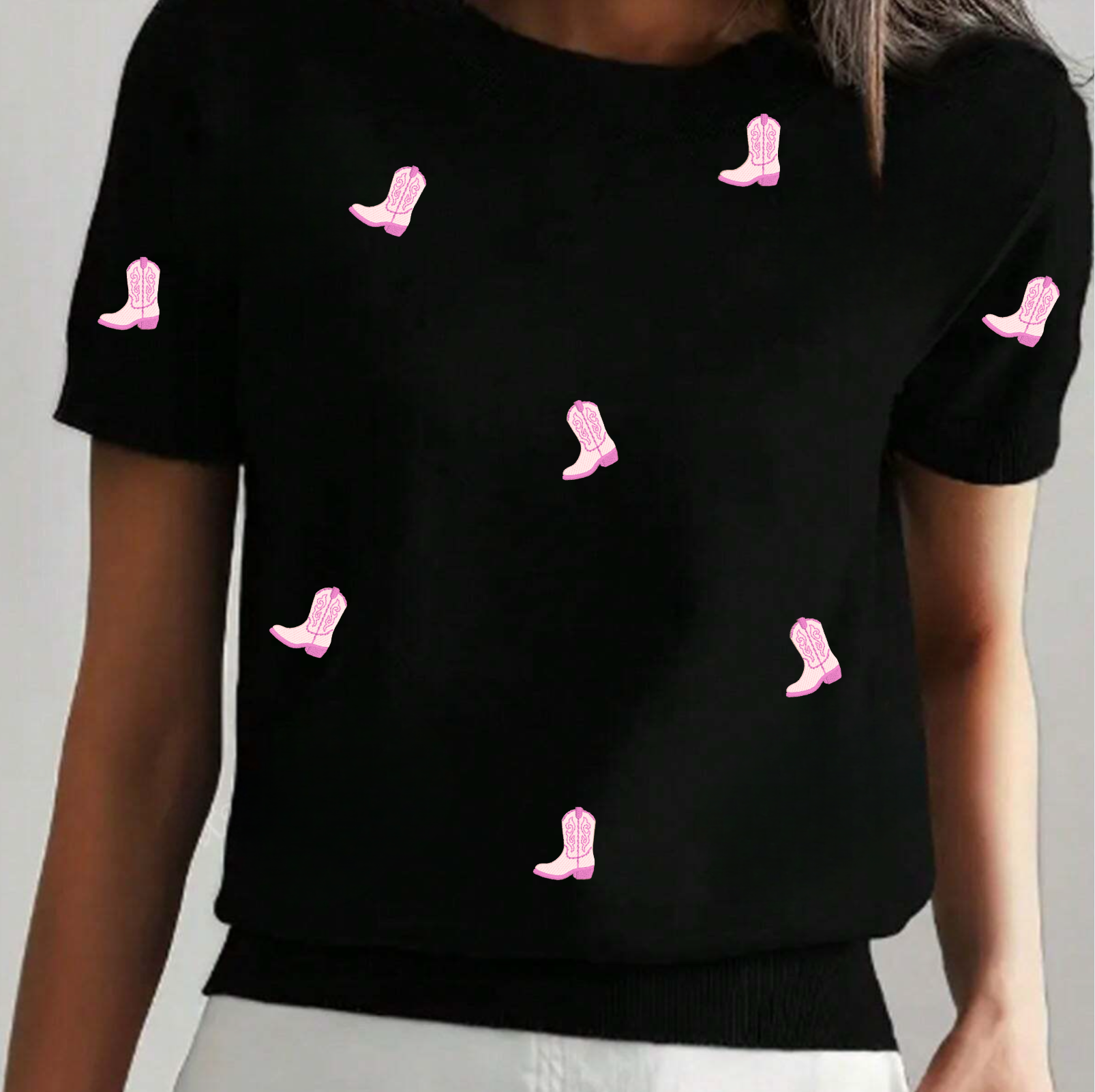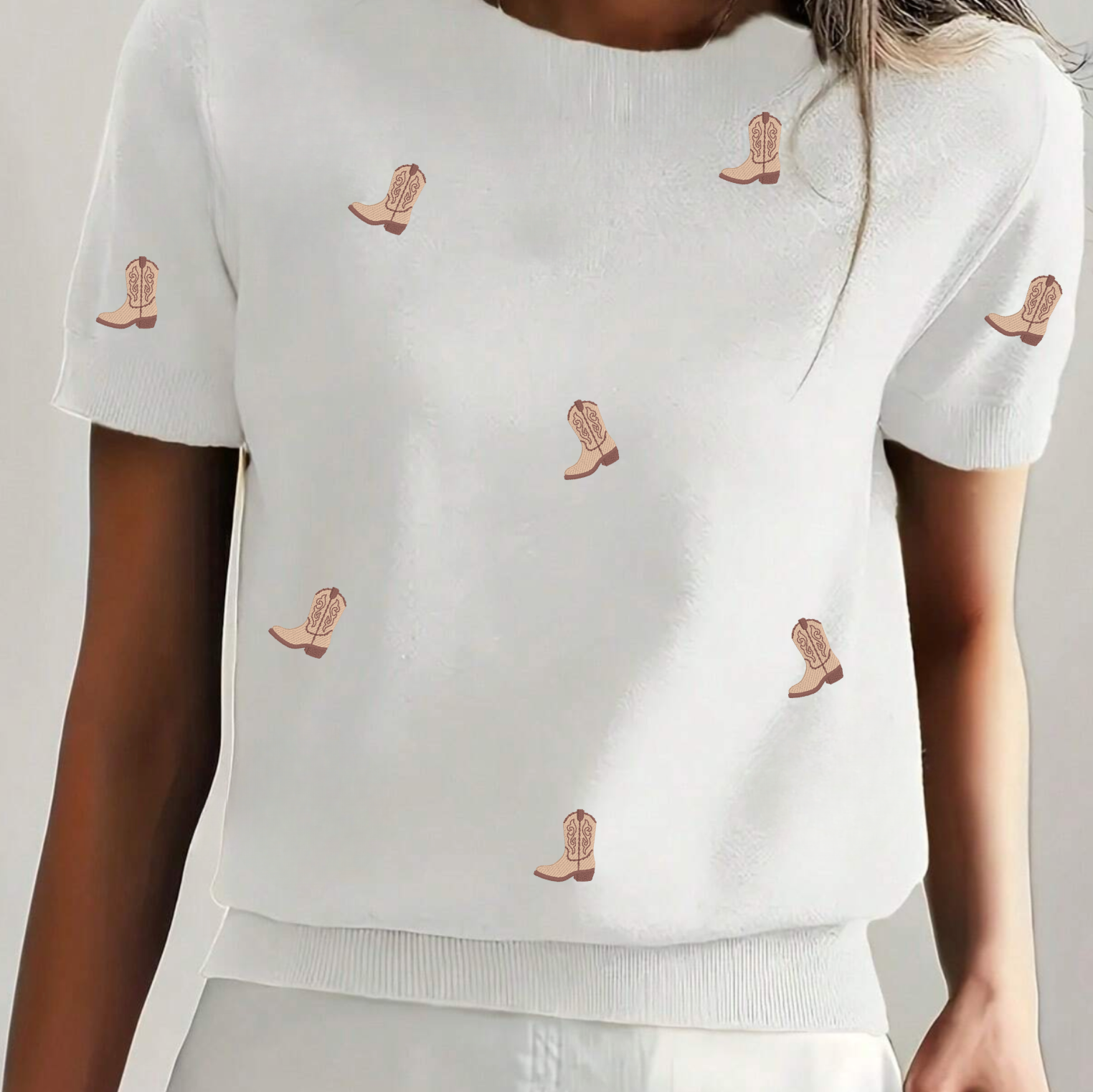 Embroidered Cowboy Boot Short Sleeve Sweater