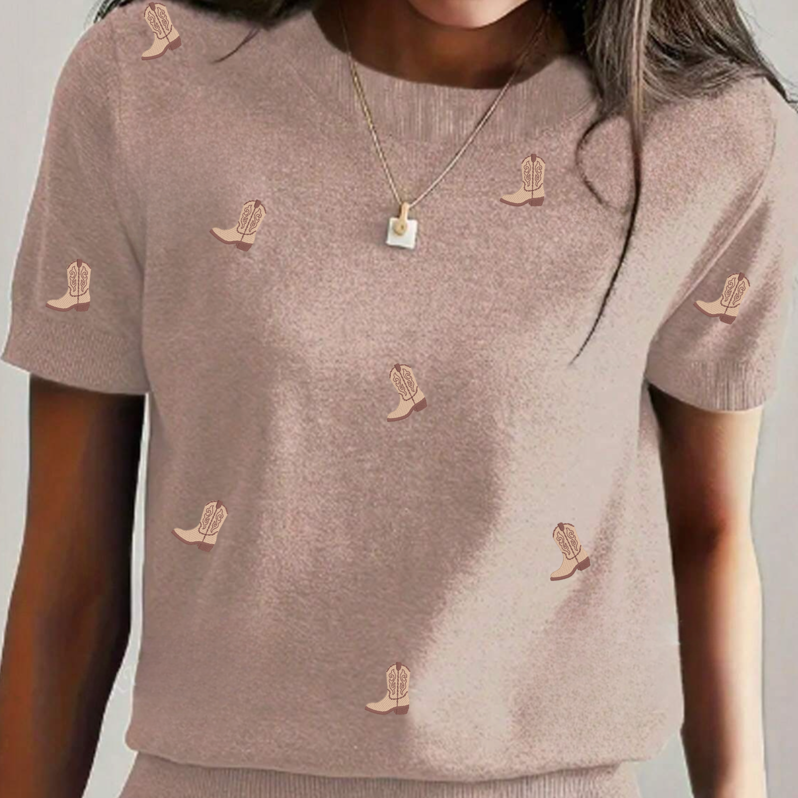 Add some western flair to your everyday look with this Embroidered Cowboy Boot Short Sleeve Sweater! 🤠