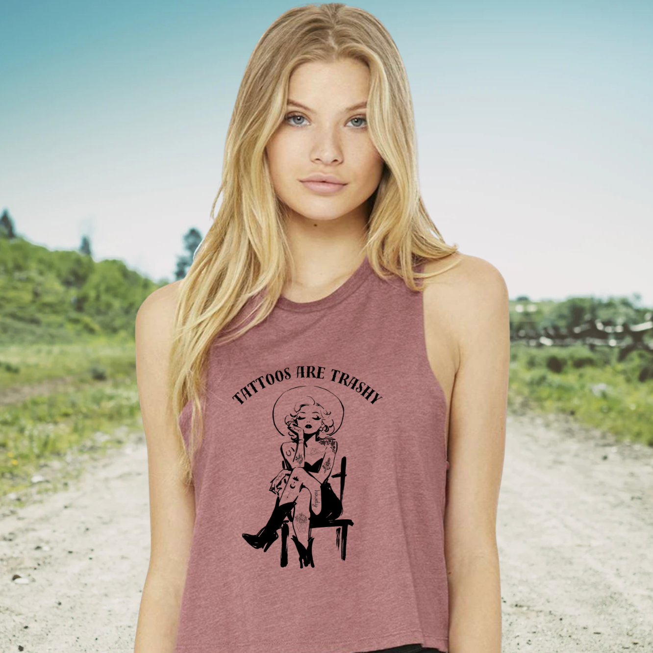 Crop tanks (6682) are Bella + Canvas brand and come in S-2XL. Tanks are a slightly relaxed fit, but if you want oversized, please size up. Racerback with raw edge hem and low cut armholes.